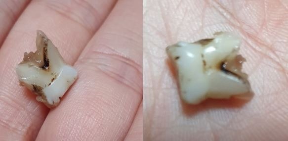 그는 "순간적으로 내 이빨이 빠진 것인가 싶어서 혀로 이빨을 다 훑어봤다"며 "동물 뼈인가 싶어서 사진을 찍은 뒤, 해당 음식점에 전화해 '포장해 간 음식에서 이물질이 나왔다'고 알리고 점주에게 사진까지 보냈다"고 적었다.