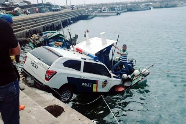 분쯤 서귀포시 안덕면 사계항에서 서귀포해경 화순파출소 순찰차가 어선 위로 추락해 인양 작업이 진행되고 있다.(독자 제공)