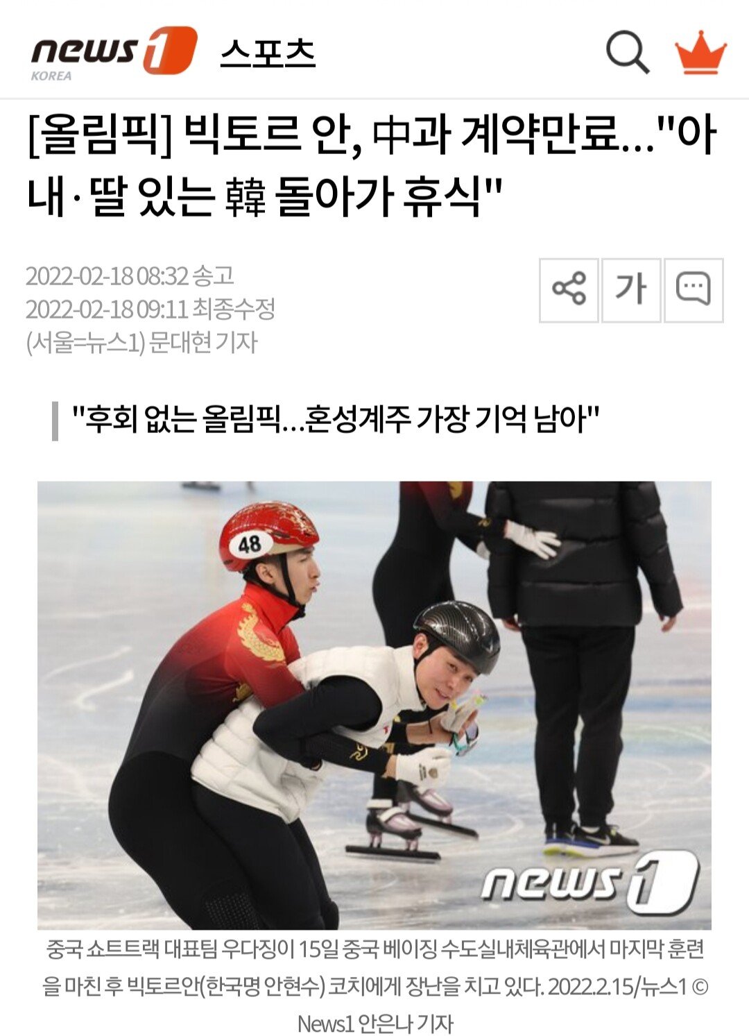 를 통해 "중국 대표팀과의 계약이 2월 말로 만료된다. 앞으로 계획은 결정되지 않았다. 올림픽이 끝나면 아내와 ㄸ이 있는 한국으로 돌아와 휴식을 취할 것"이라고 밝혔다.